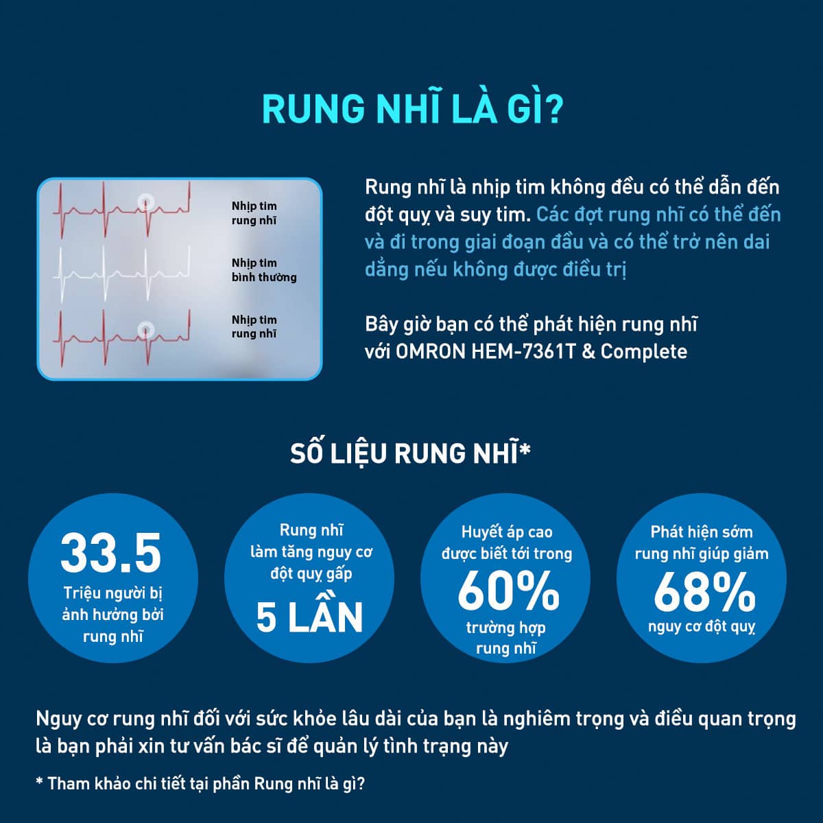 OMRON HEM-7361T đo và phát hiện huyết áp và rung tâm nhĩ (AFIB) cùng một lúc. Kiểm tra kép cho 2 người dùng giúp người dùng kiểm tra toàn diện về nguy cơ đột quỵ với một thiết bị, trong một lần đo. Được thiết kế dành cho gia đình, chức năng 2 người dùng cho phép lưu trữ và truyền dữ liệu kết quả đo của 2 người dùng riêng biệt sang điện thoại thông minh của họ. Là thiết bị y tế gia đình chất lượng cao, được tin dùng bởi hàng triệu người trên thế giới. Hãy đầu tư cho sức khỏe tim mạch của bạn ngay hôm nay với HEM-7361T!